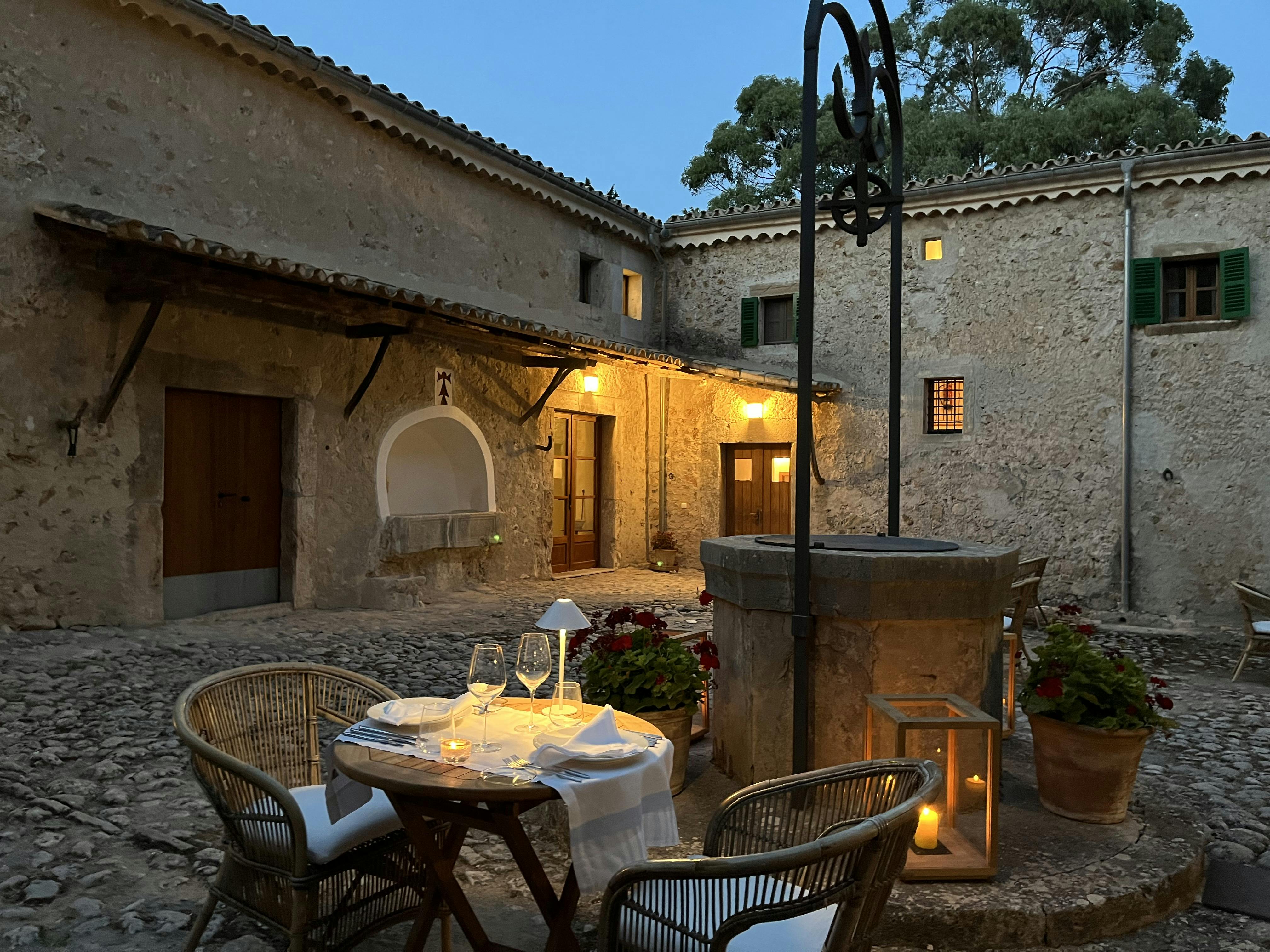 En las cenas se prepara un menú de tres platos a elegir entre cinco entrantes, cinco principales y cinco postres, para disfrutar bajo los árboles de nuestro jardín centenario, en el patio o en el restaurante si el tiempo no acompaña, y en la más absoluta tranquilidad del lugar.